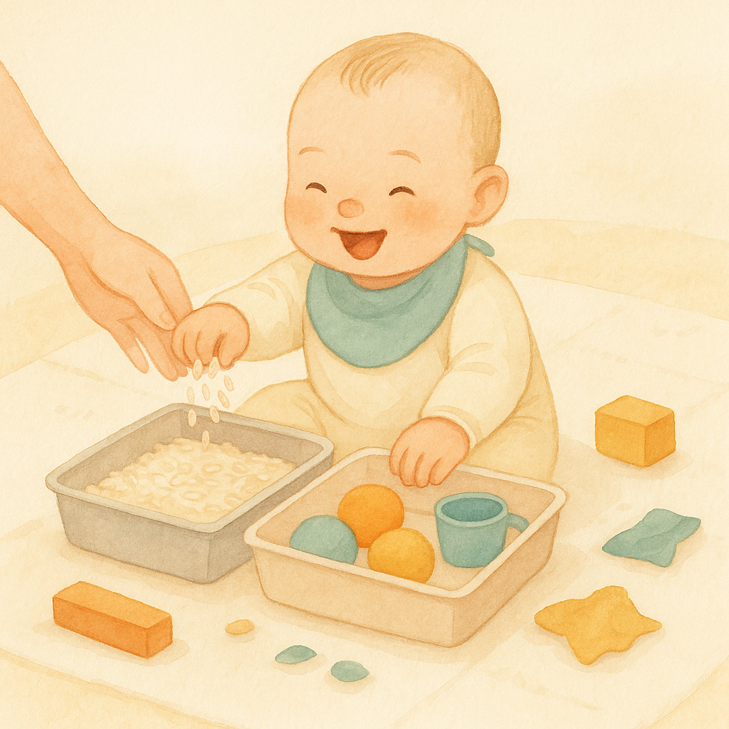 투명 통에 쌀이나 콩, 보리를 넣고 아이가 손을 넣어 만져보게 해보세요. 고슬고슬, 말랑말랑한 촉감이 아이의 감각 발달을 자극합니다. 작은 컵이나 숟가락으로 옮겨 담게 하면 집중력도 길러져요. 다만, 알갱이를 입에 넣지 않도록 항상 주의가 필요하답니다. 👶🫘