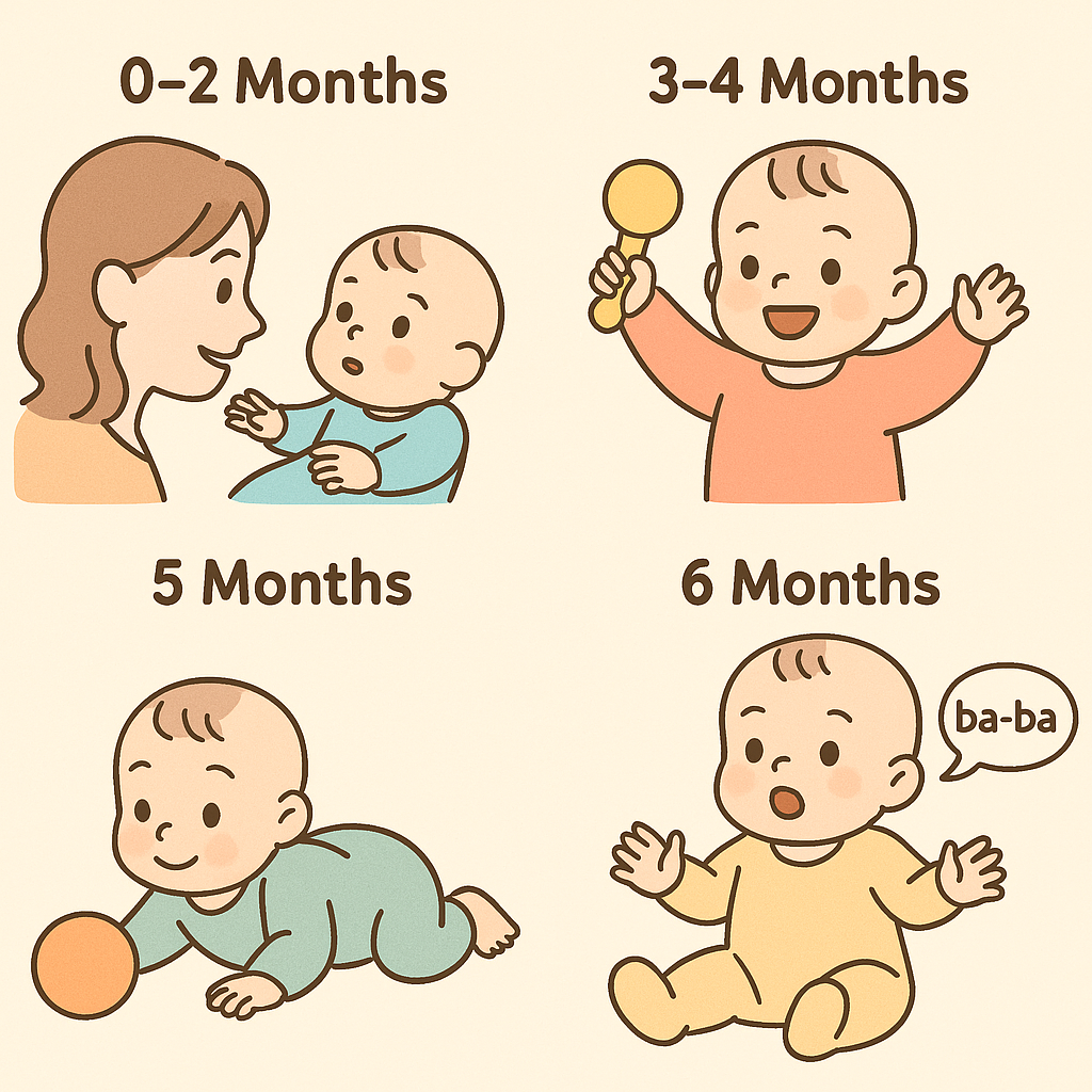 사회성 발달도 활발해서 낯가림의 시작, 엄마·아빠를 향한 애착 반응, 웃음·소리·입술 움직임이 풍부해져요. 또한 옹알이가 점점 복잡해지며 “바바바” 같은 반복음이 나타나는 아기도 있어요.